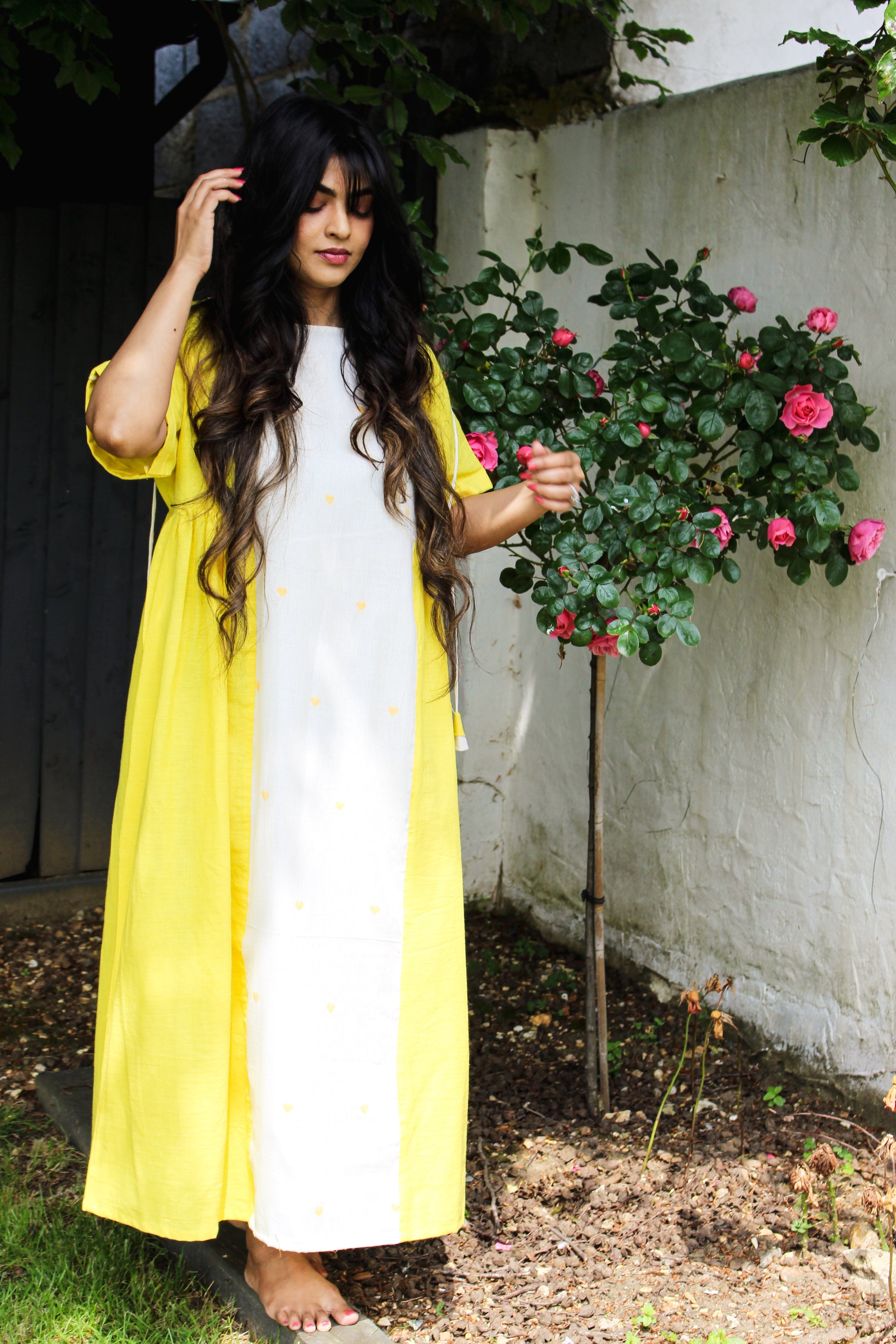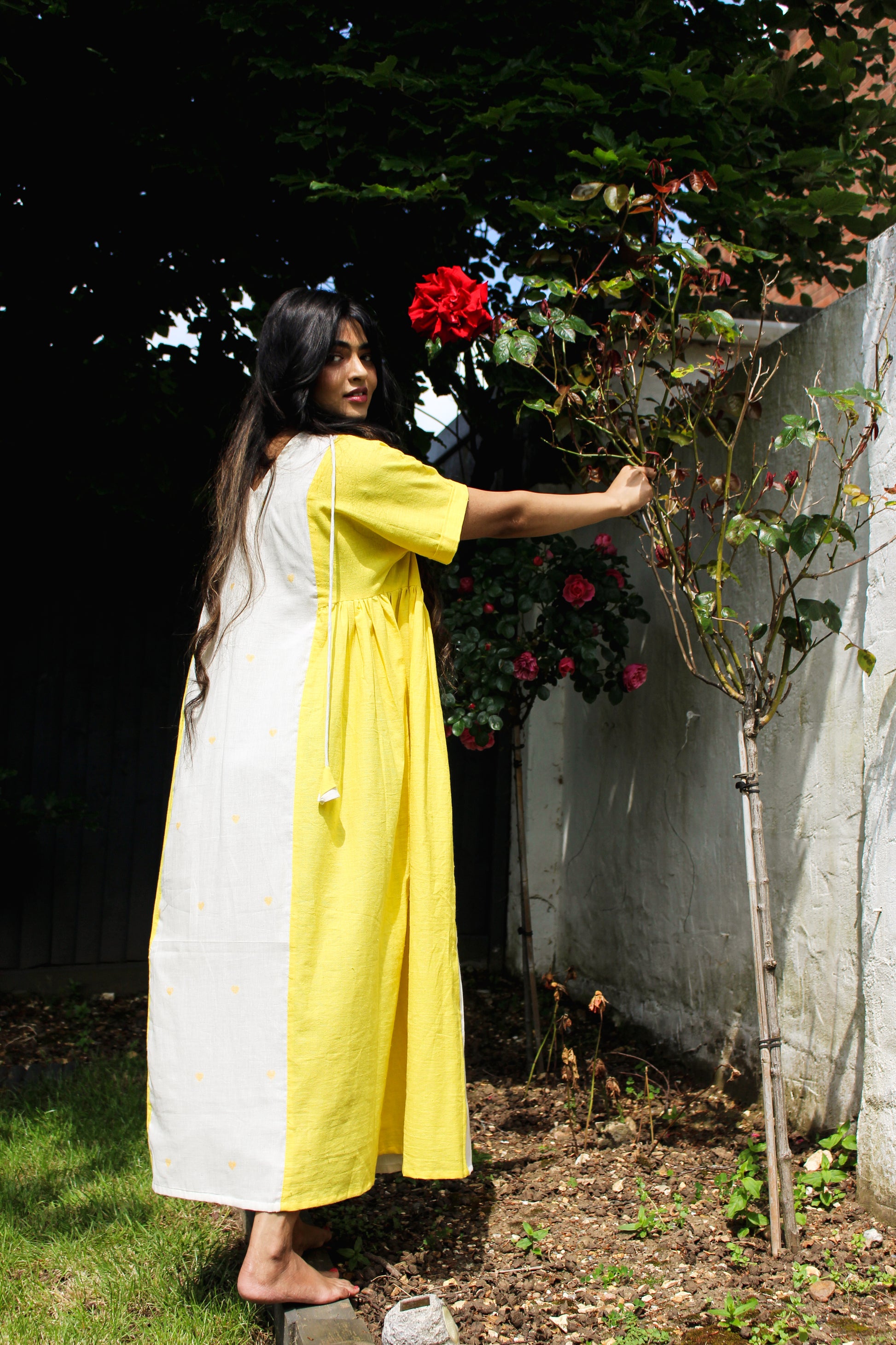 Sunshine in dress form. Brighten up your wardrobe with this charming dress featuring a stunning combination of vibrant yellow with crisp Jamdani white.