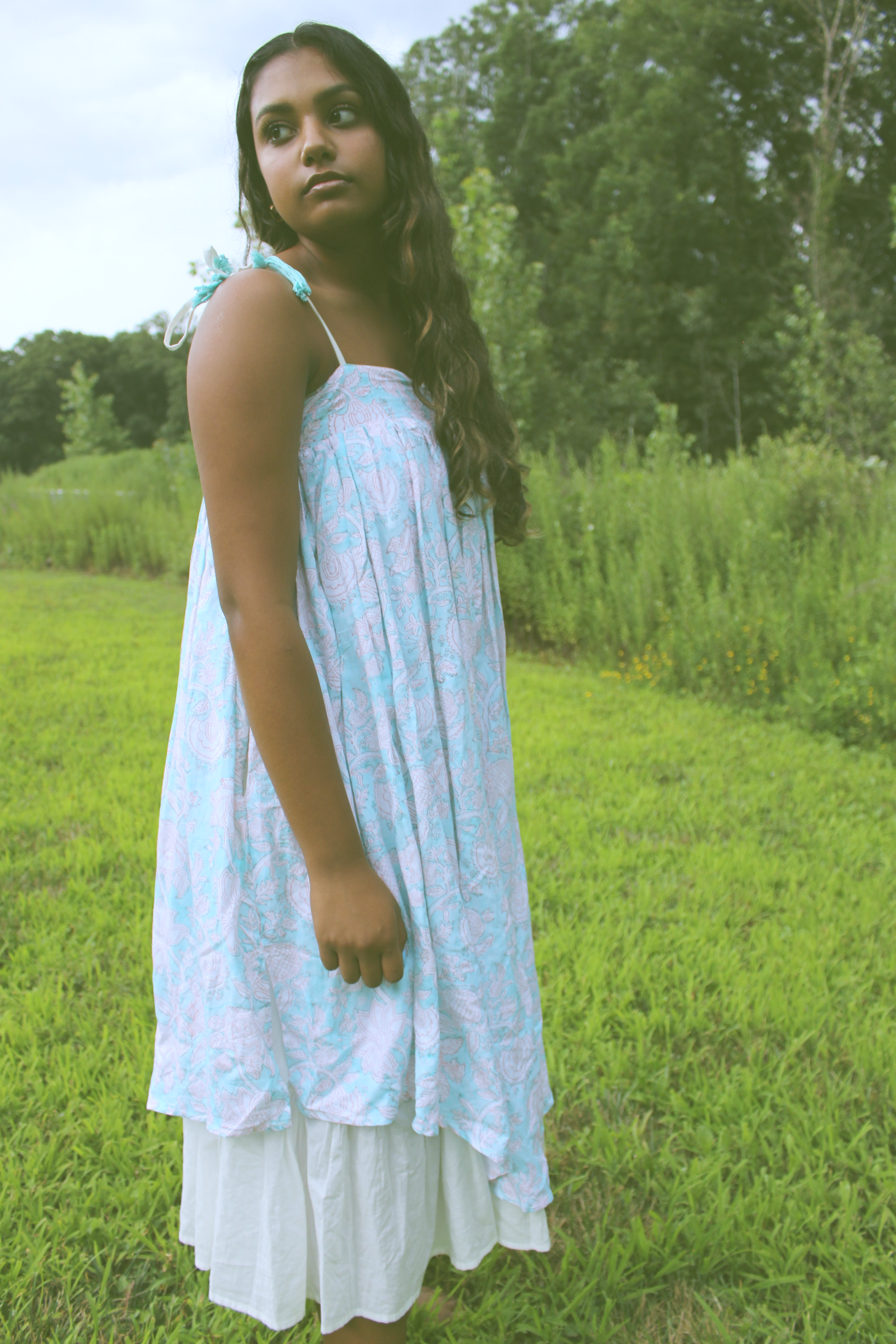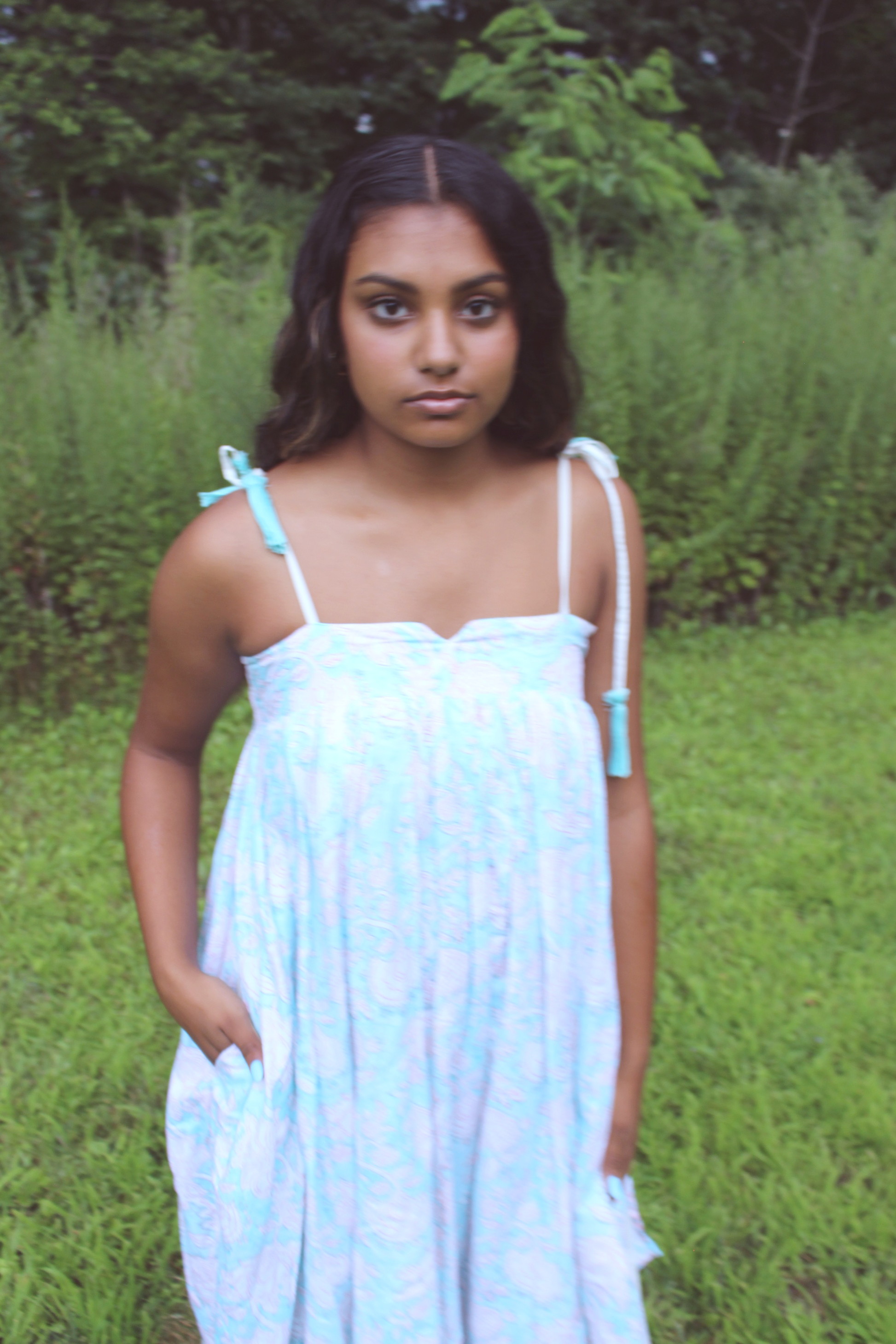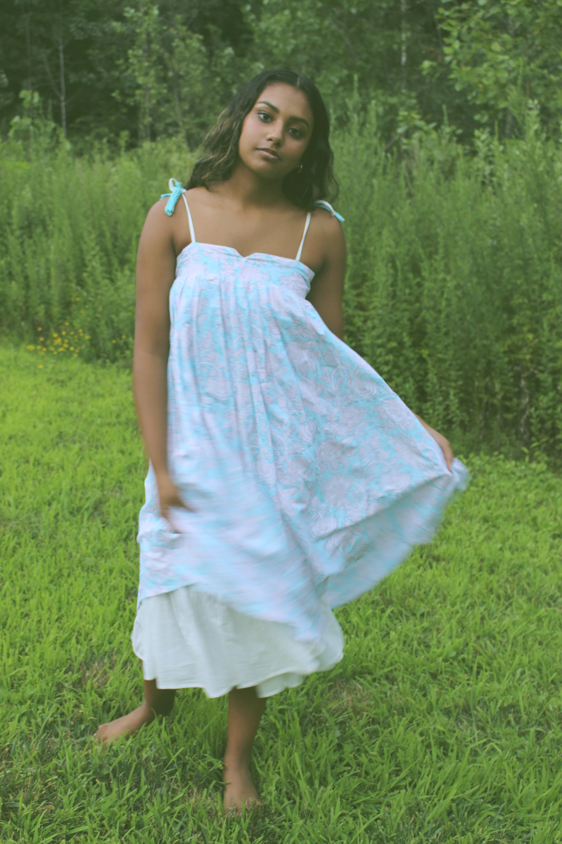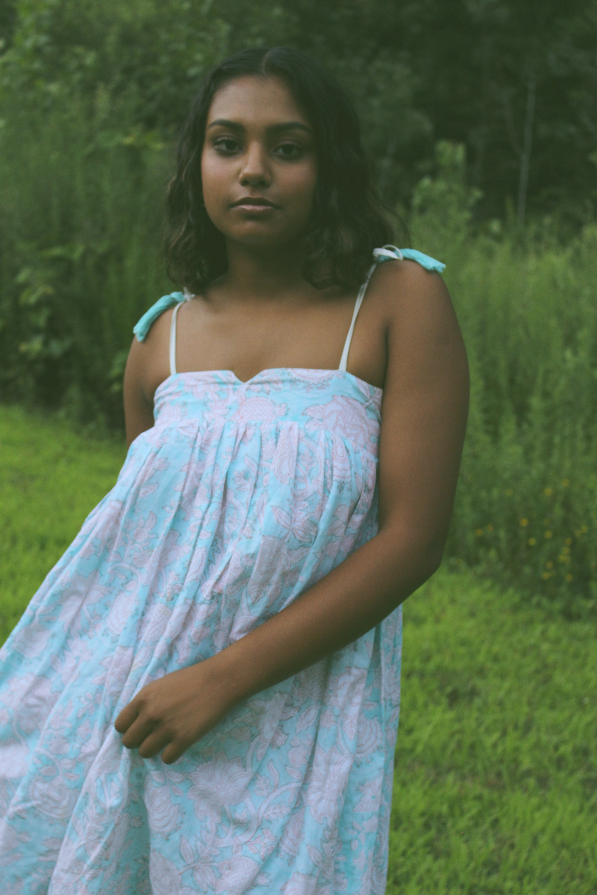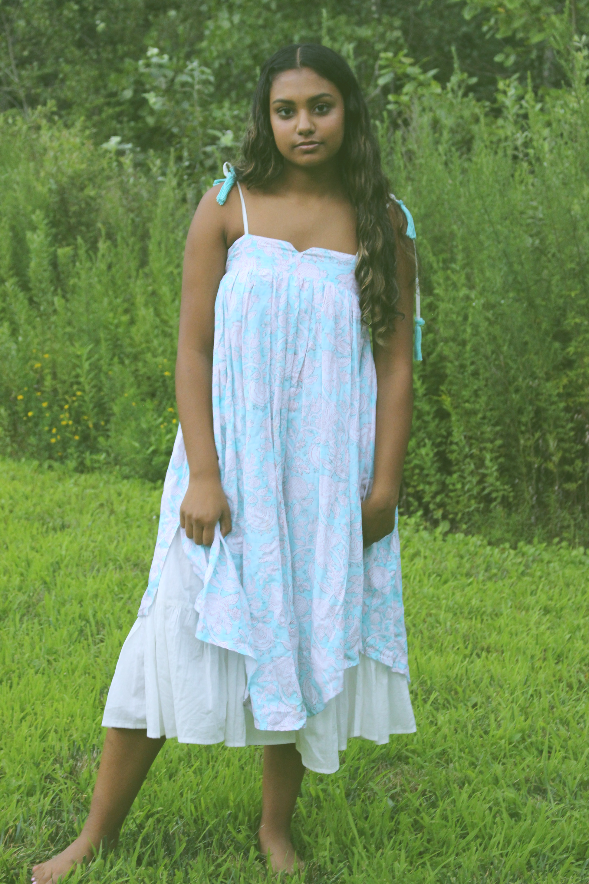 This dress is a boho dream. Embrace the slow craft of our nature inspired handblock printed hemp and bamboo dress, dyed with organic love. The organic cotton lining of the dress adds to flow and gives a ruffled accent around the edges of the dress and pockets.  The print is created using organic dyes and hand carved wooden blocks by the artisans of Jaipur, India. The garment is sewn by women of Sewing the Seeds social enterprise.