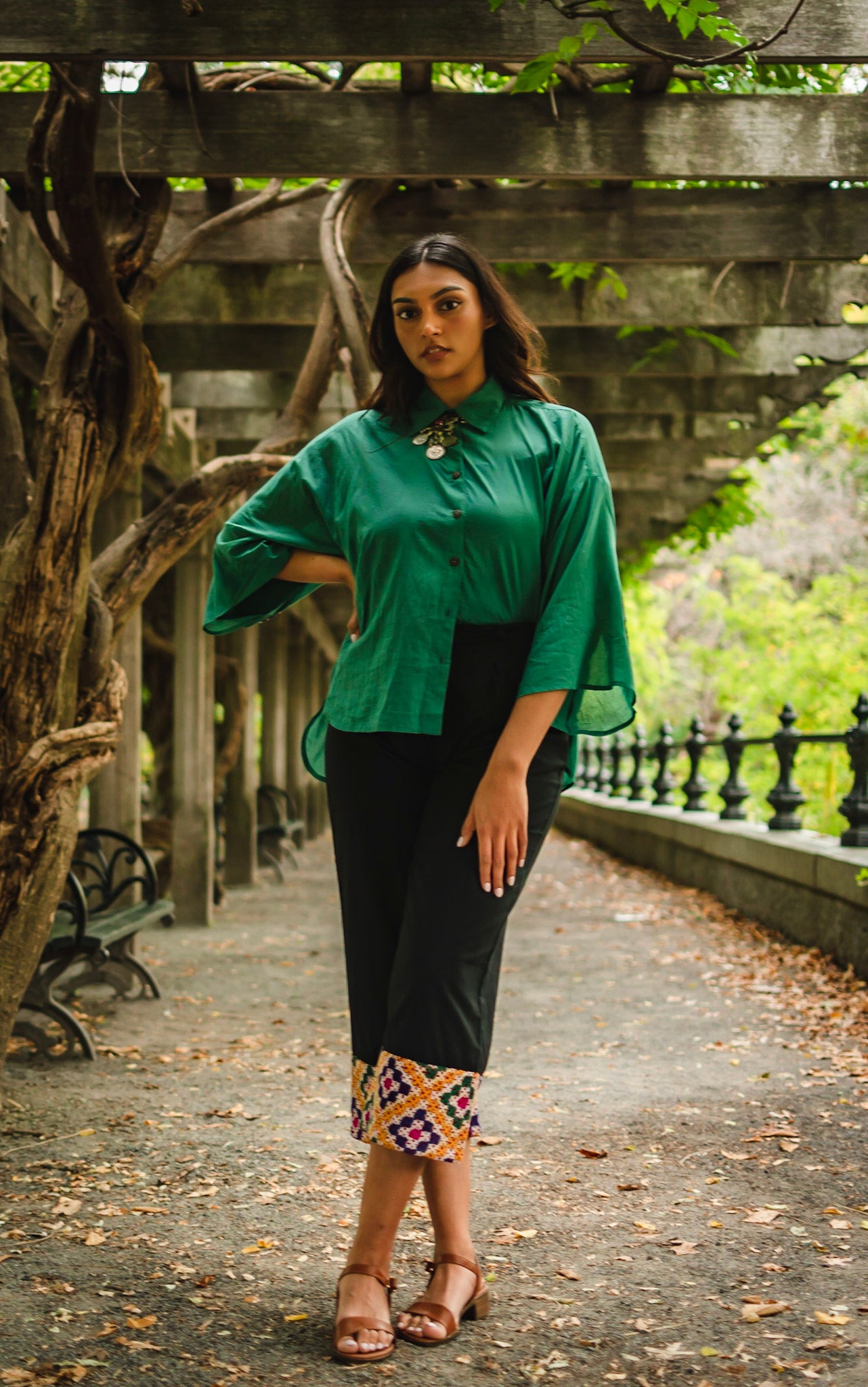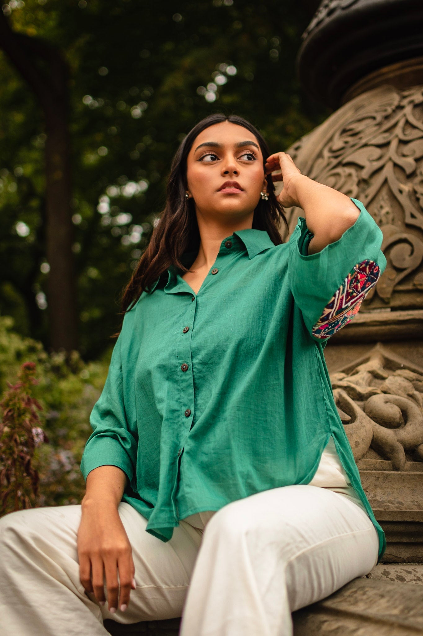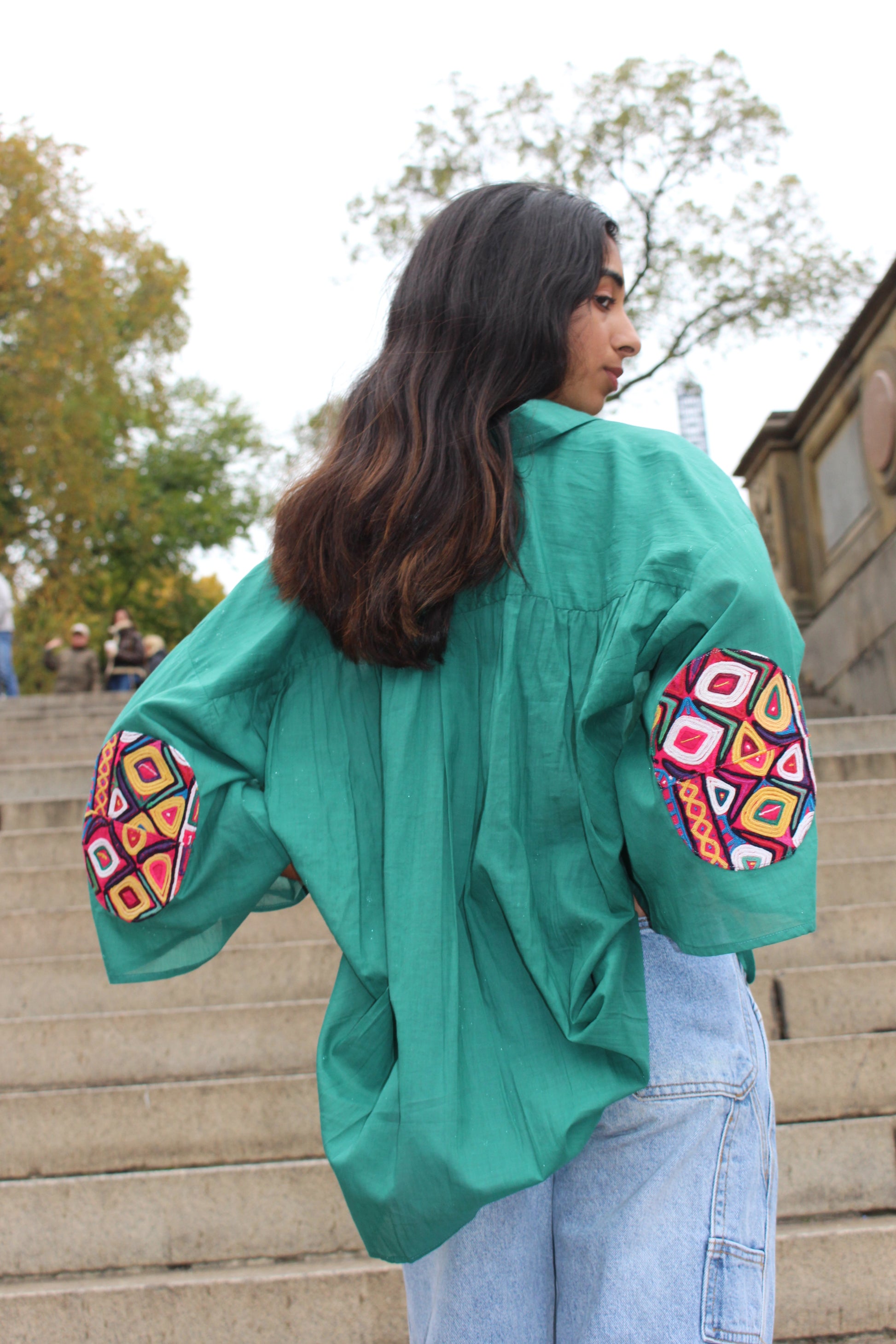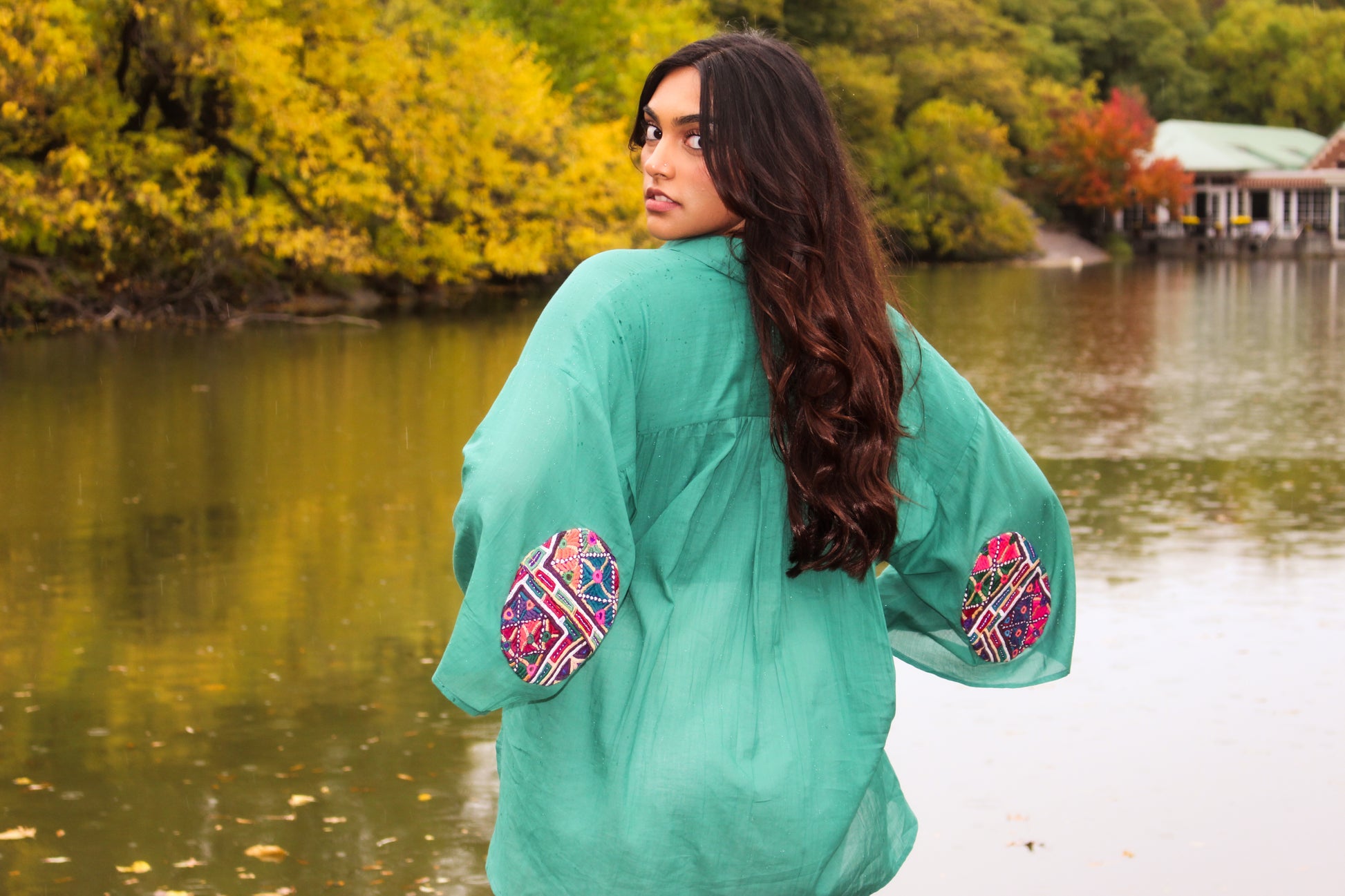 Oversized high-low shirt with dropped shoulders in teal green with wooden buttons and subtle bell sleeves. Elbow patch embellished with preloved Kutchi hand embroidery by the artisan of Kutch, Gujarat.