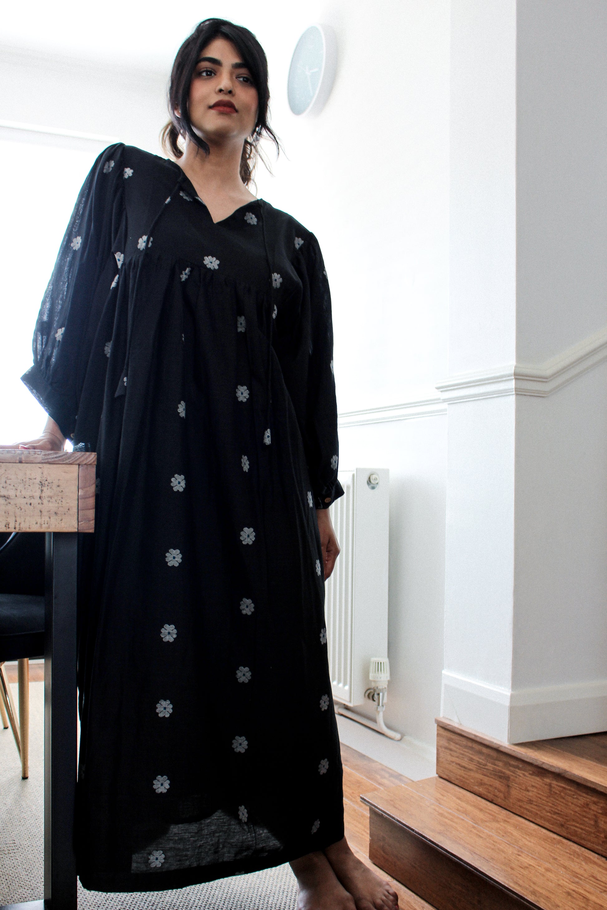Made from handspun and handwoven fabric in Jamdani cotton. The artisanal fabric is slowly made on the looms in West bengal and Madya Pradesh, India. The garments are sewn by women artisans from Sewing the Seeds organization which works on women empowerment through fair employment.