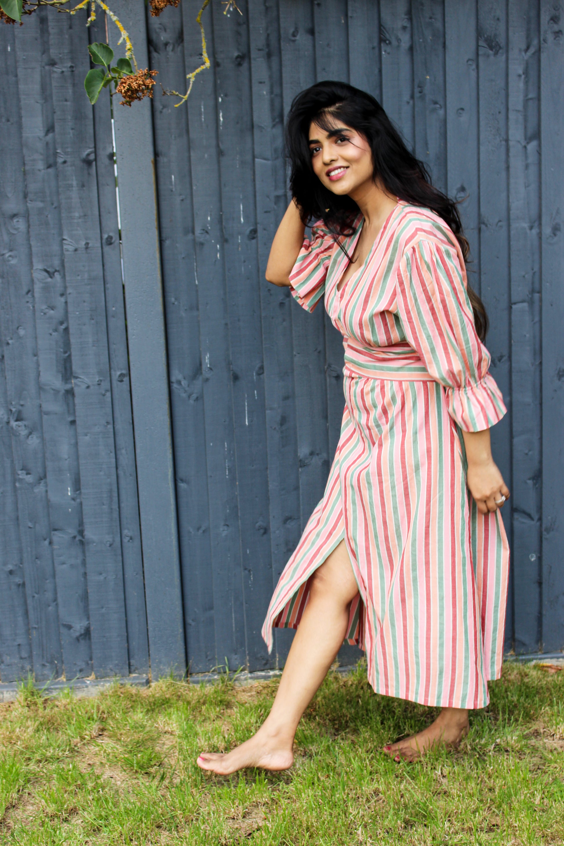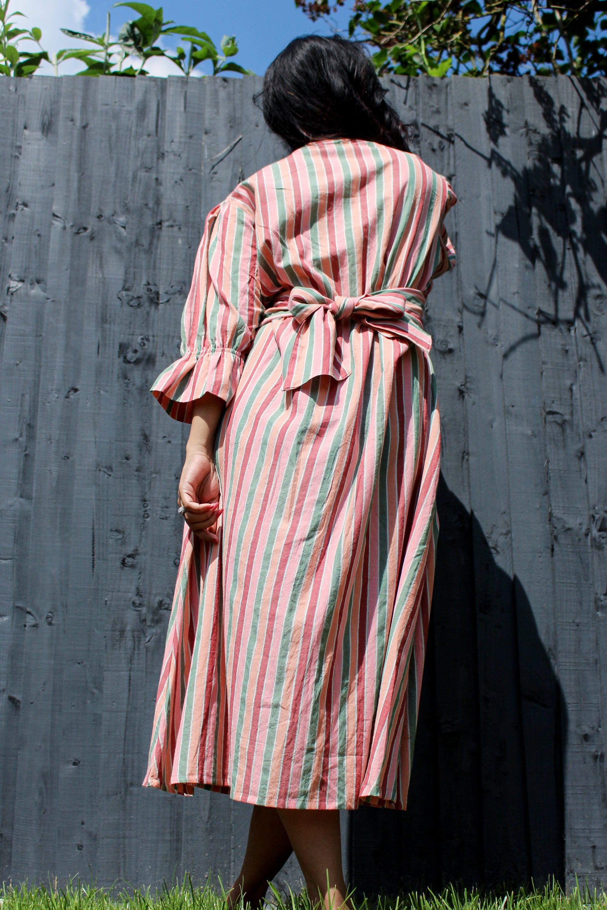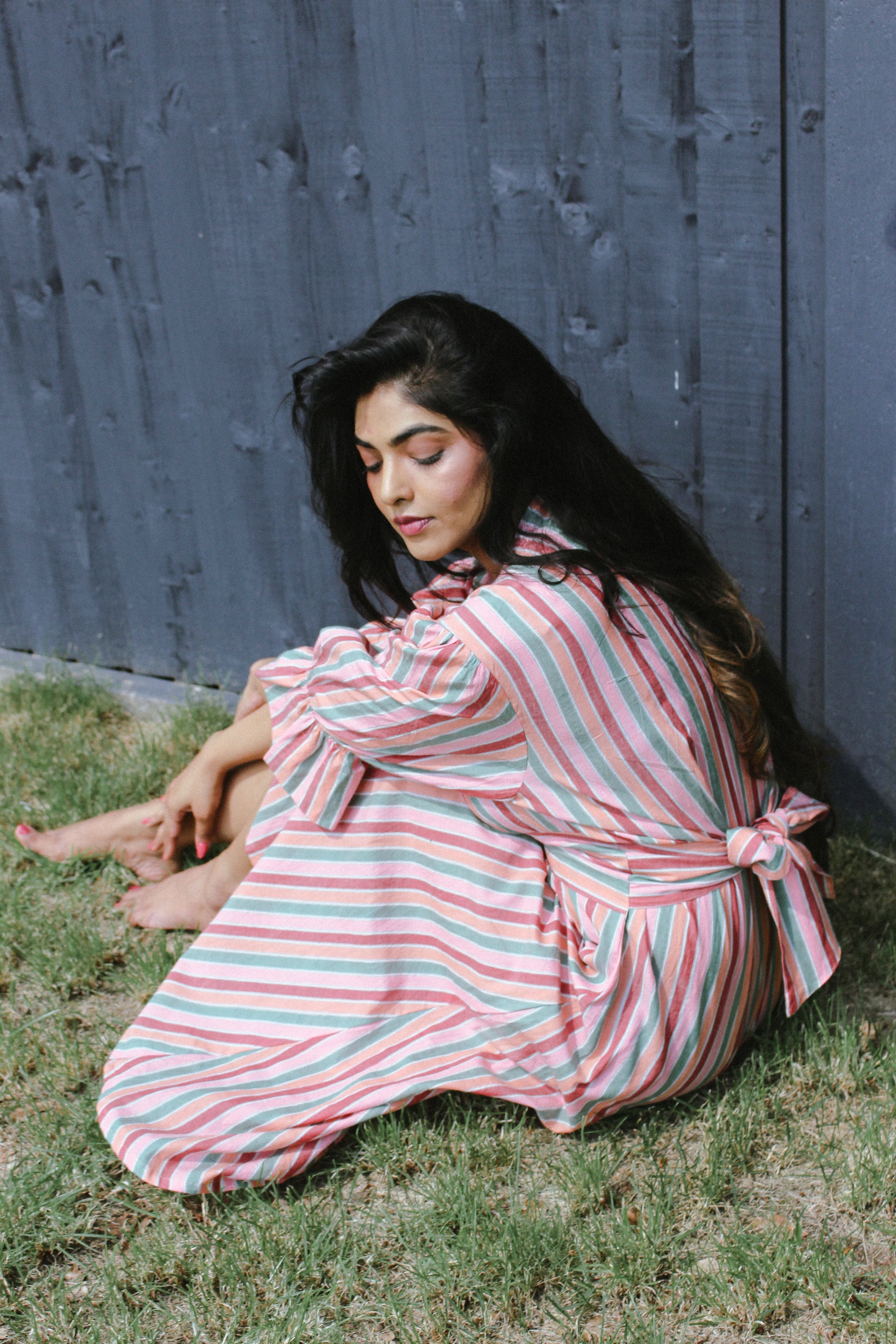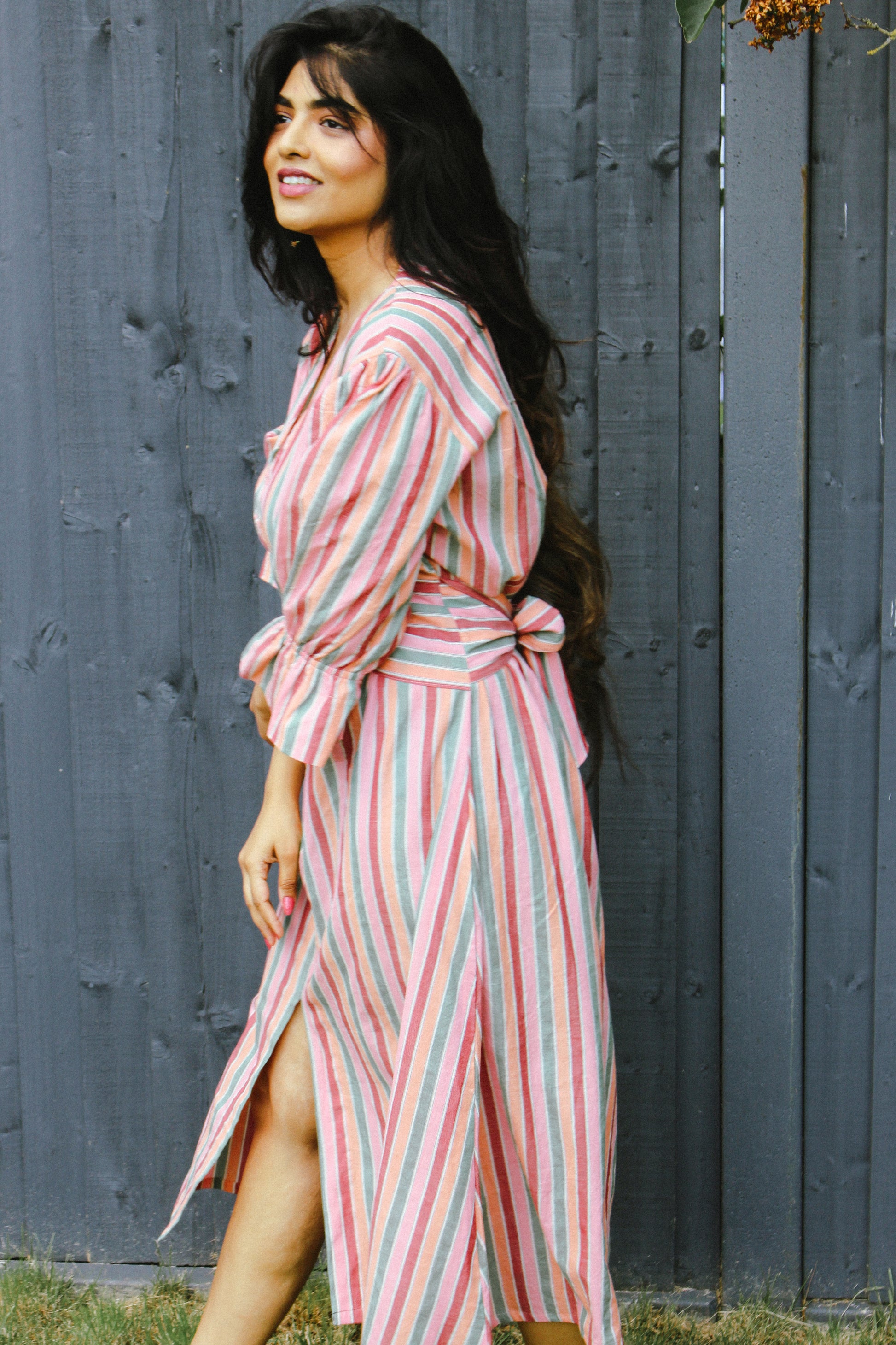 The flirty and feminine London dress with its vibrant multicolored stripes, voluminous sleeves, and a waist tie for an adjustable fit is perfect for a casual day out or a date night.