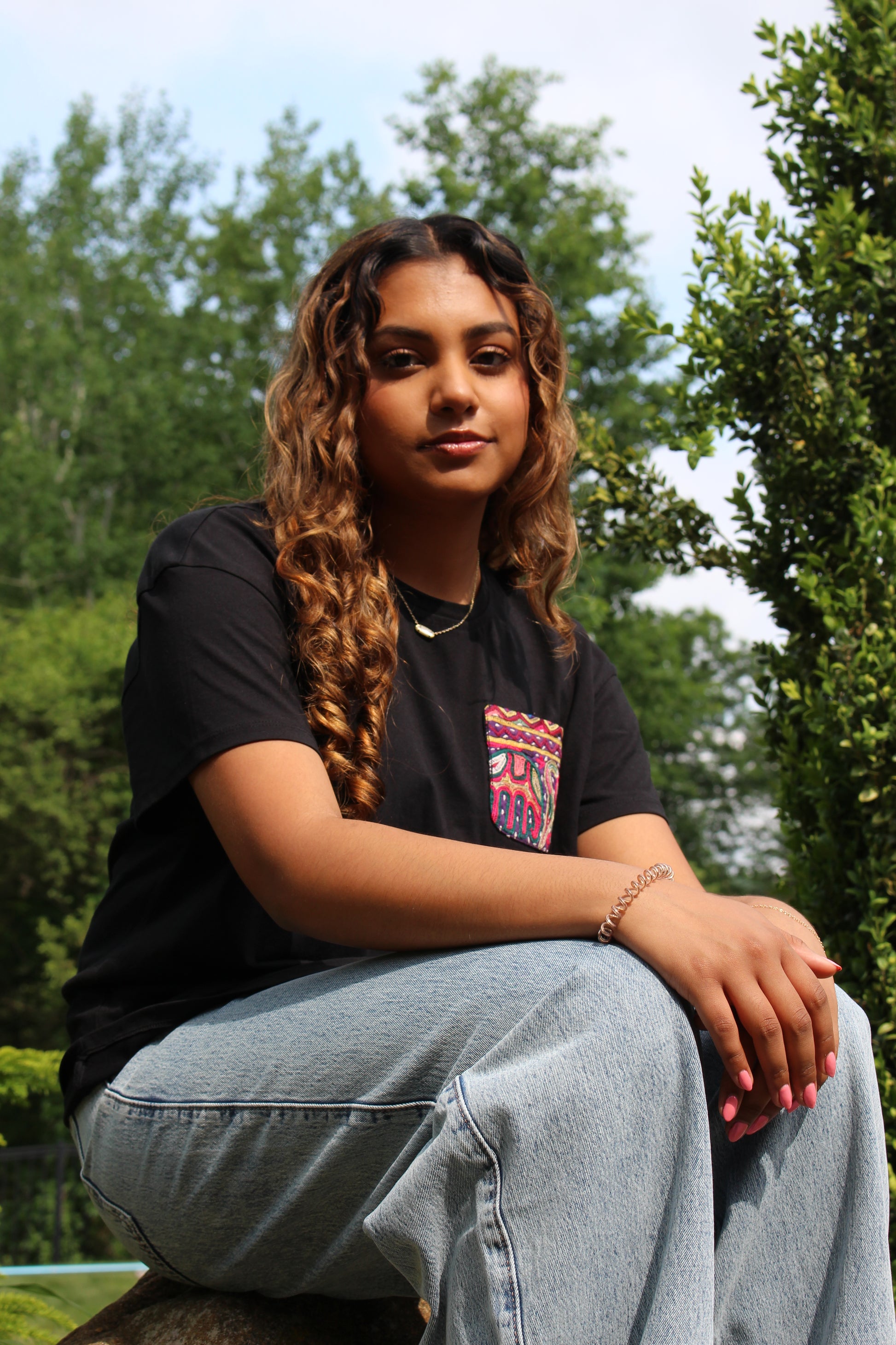 Classic GOTs certified Organic Black Tee which make a perfect everyday staple with a vibrant kutchi hand embroidered pocket by artisans of Kutch, Gujarat. Relaxed and comfortable fit for everyday wear.